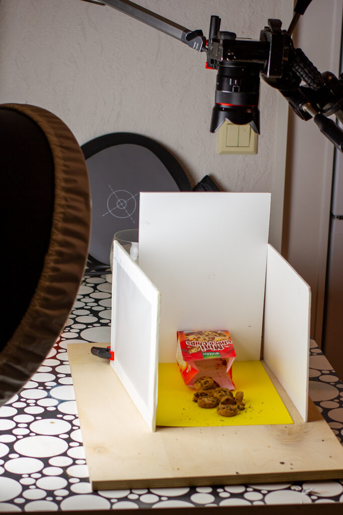 Eli ideasta toteukseen. Keltainen kartonki pöydälle ja sen päälle suklaakeksipaketti ja vähän keksejä. Ja yksi valkoinen kapalevy heijastimeksi ja pikkuisen valonhajoittajaa eteen. Eli kuvausasetelma näytti tältä: