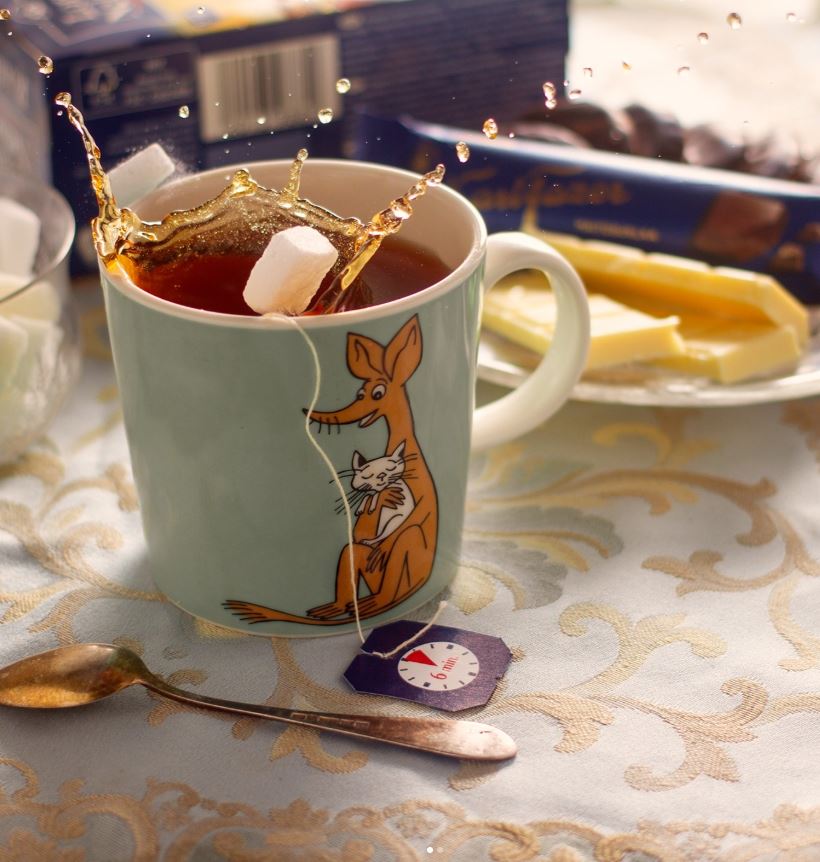 Alla oleva Muumi- muki kuva on otettu yhdellä kerralla. Ensin hiukan tehtiin kokeiluja ja sitten lopullinen asetelma ja otettiin kuva. Eli ajoitus ja valot oli kokeiltu ennakkoon ja sitten asiat paikoilleen ja yksi ainoa kuva.