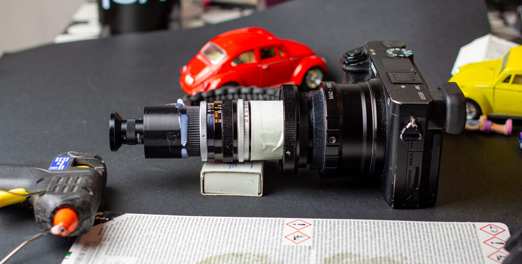 Makrolaajakulman tekeminen vaatii myös makrokuvaamista, koska lopullinen kuva kuvataan ilmasta. Eli ensimmäisen objektiivin kuva kuvataan toisella objektiivilla. Ja tässä tulee makrokuvauskin mukaan eli joudutaan kuvaamaan aika pieni kuva sieltä kahden objektiivin välistä.